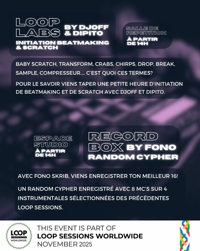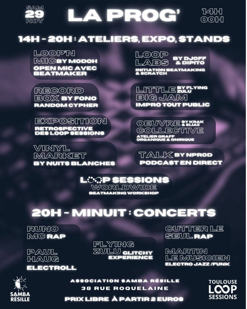 Samba Résille accueille une nouvelle fois un évènement Loop Sessions. Ces sessions réunissent les Beatmakers (producteurs) sous un même toit pour une rencontre de création et de partage.