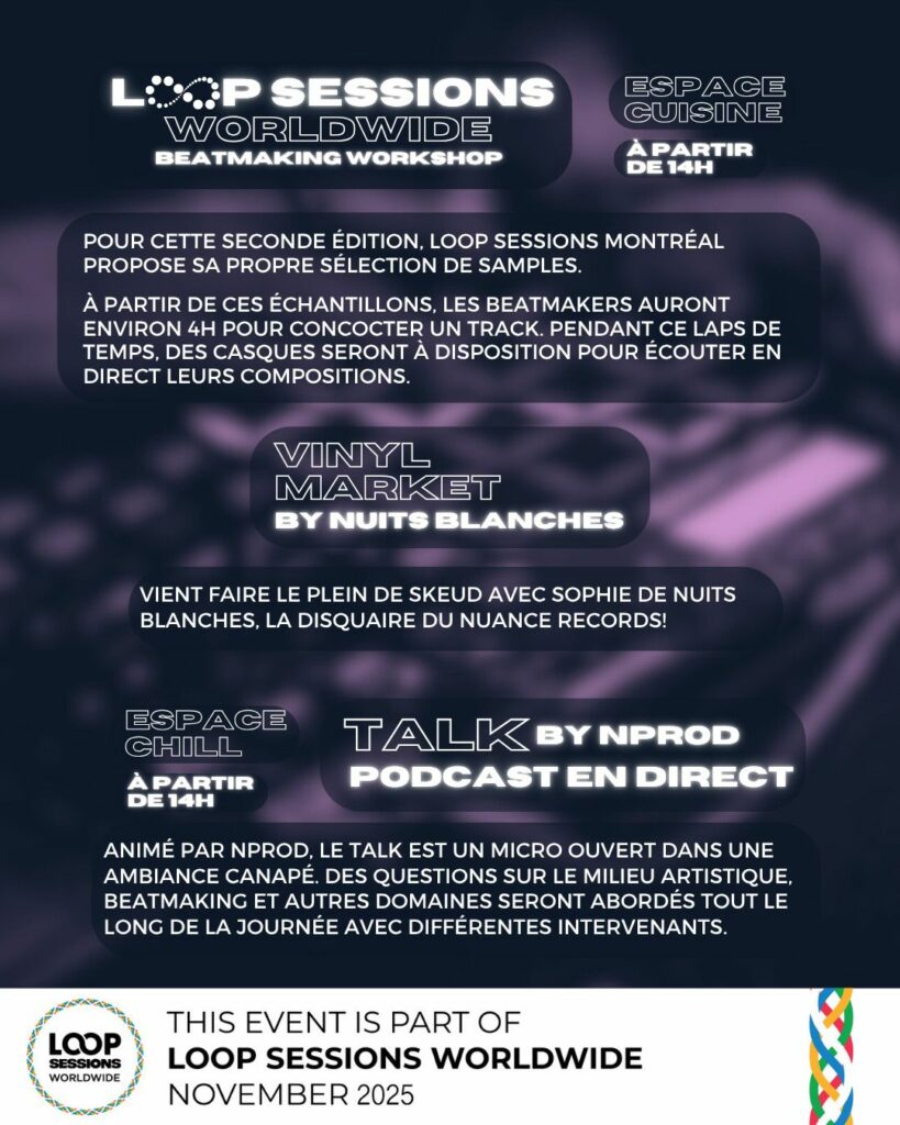 À l’aide d’échantillons provenant du même disque et avec l’équipement de leur choix, les participants ont quelques heures pour créer une piste instrumentale en plus d’échanger astuces et conseils avec leur pairs.