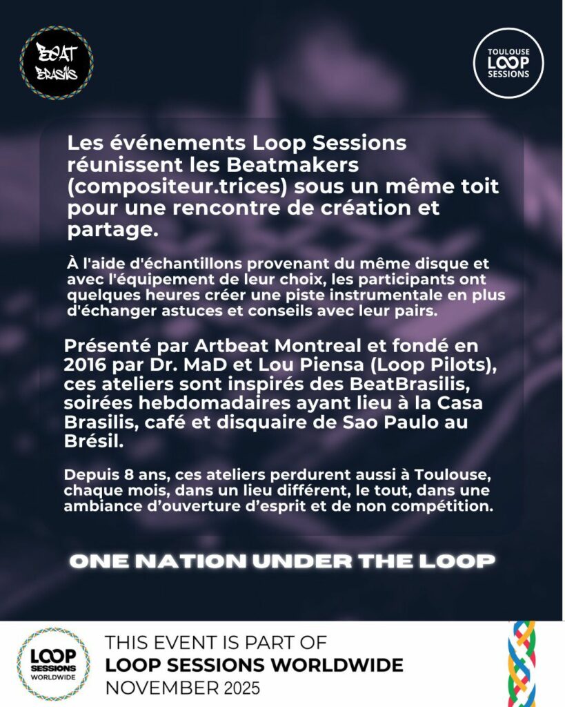 Présenté par Artbeat Montreal et fondé en 2016 par Dr.MaD et Lou Piensa (Loop Pilots), ces ateliers sont inspirés des BeatBrasilis, soirées hebdomadaires ayant lieu à la Casa Brasilis, café et disquaire de São Paulo au Brésil.