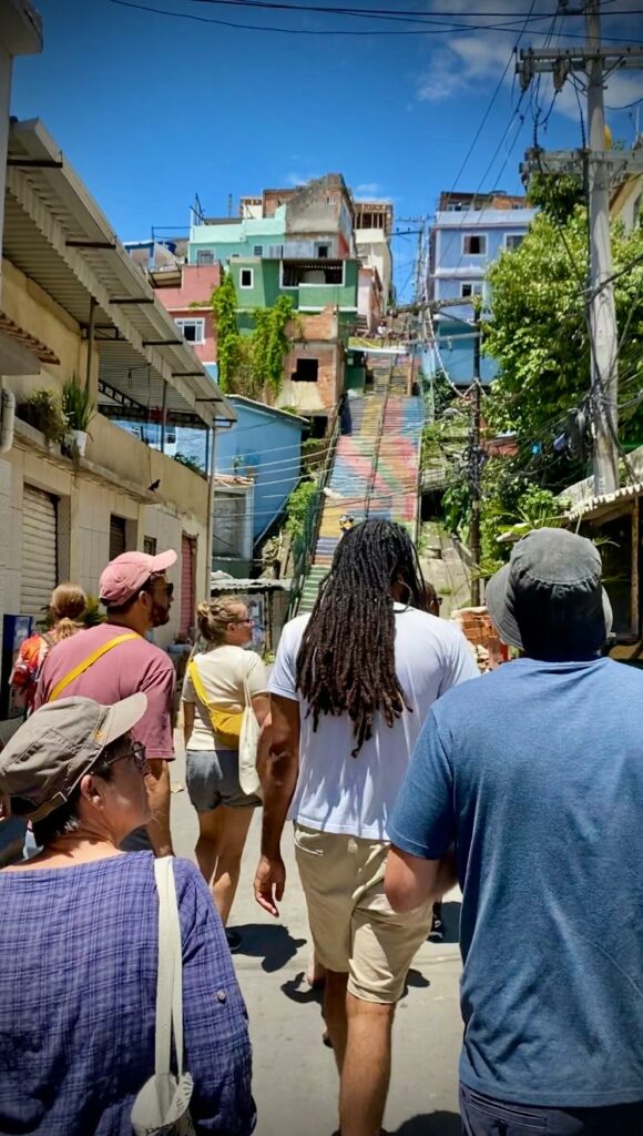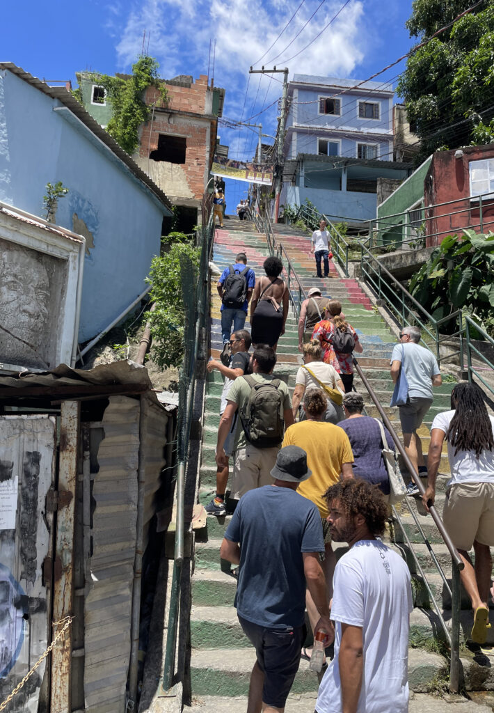 La visite de la favela de Providencia est une opportunité unique ! Aucun touriste n’y vient jamais, elle ne fait pas partie des rares favelas que l’on peut visiter avec un guide « accrédité ». Même les cariocas n’y mettent jamais les pieds. Le chauffeur de taxi qui nous a déposés au téléphérique qui y mène nous a demandé si on n’était pas fous. Accompagnés d’une employée de la Casa Amarela, il faut gravir cet escalier quasi religieusement et sans prendre de photos (enfin ça je l’ai appris après). La visite est perturbante: c’est à la fois magnifique et laid, agréable et angoissant. Naviguant entre les ordures, le linge qui sèche, les enfants qui courent dans nos pattes, les surveillants armés et les points de vue superbes, un sentiment de malaise surgit: Suis-je légitime à déambuler chez ces gens qui ne m’ont pas invité ?