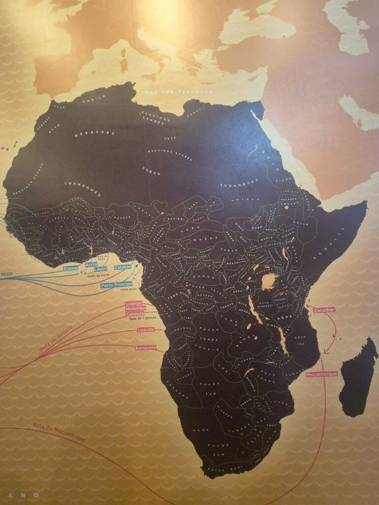 Carte murale gigantesque exposée dans la première salle du Musée de l’histoire et de la culture afro-brésiliennes (Muhcab) quartier de la « Petite Afrique « de Rio de Janeiro, illustrant les routes de la traite négrière d’Afrique au Brésil.
